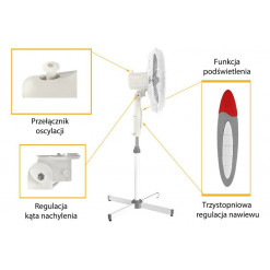 Wentylator LTC oferuje również możliwość regulacji kąta nachylenia czaszy, co powoduje pionową zmianę kierunku nawiewu. Dzięki regulowanej wysokości stojaka, urządzenie można dopasować do indywidualnych potrzeb użytkownika.