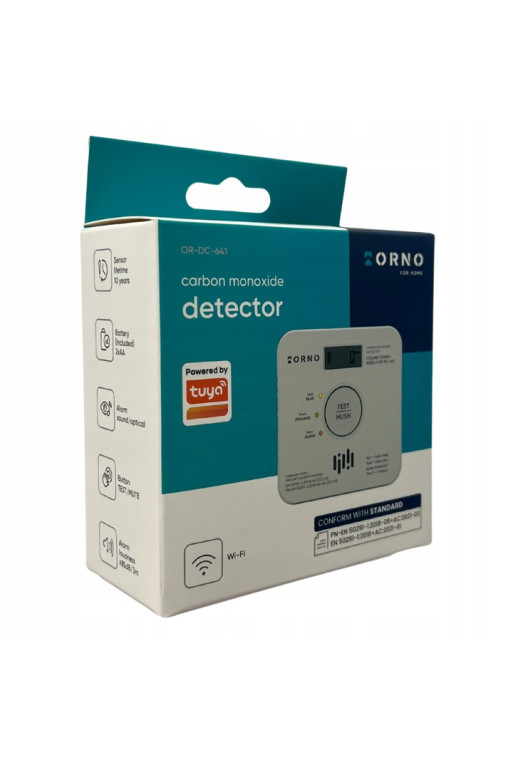 Produkt posiada podświetlany przycisk TEST, który pozwala sprawdzić poprawność działania czujnika. Żywotność czujnika wynosi 10 lat. Zasilany jest dwoma bateriami alkaicznymi AA (dołączone do zestawu). Wymiary urządzenia: 93x93x28,5 mm.