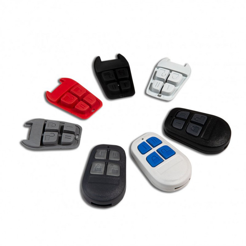 Obudowa pilota w kolorze czarnym z czterema jasnoszarymi przyciskami.